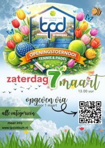 Openingstoernooi - klaar voor het nieuwe seizoen? Op zaterdag 7 maart organiseren we een gezellig tennis- en padeltoernooi voor alle leden en alle categorieën. Een sportieve dag met leuke wedstrijden en verrassende koppels! Inschrijving & opzet- Inschrijven doe je individueel